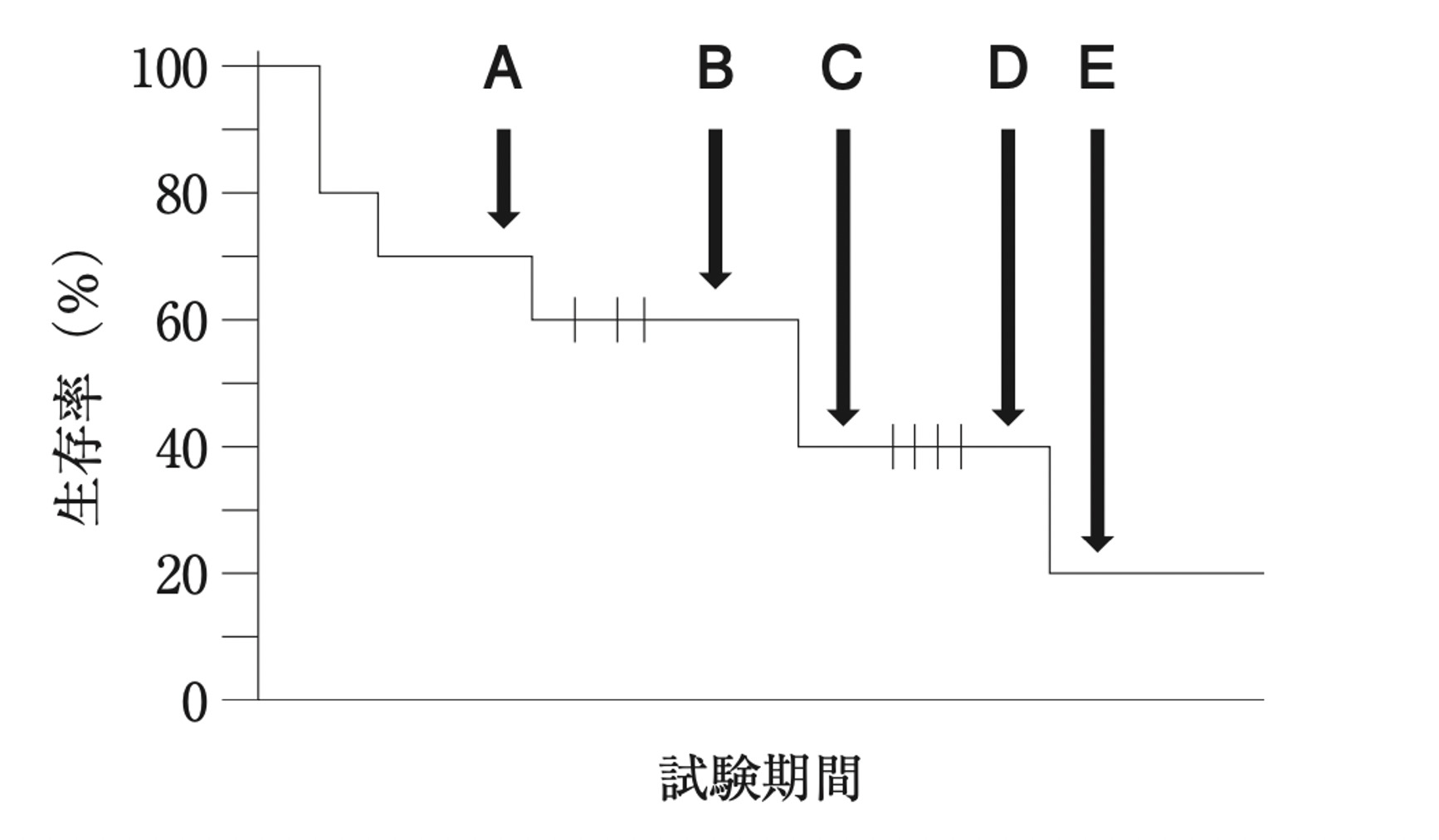 時点Cより4名が脱落していることから、時点Dにおいて、観察を継続している被験者数は2名である。その後、生存率が20%に低下していることから、0.2=0.4(1-死亡率)より、5回目のイベント発生時の死亡率は2分の1であると推察される。よって、2名中1名が死亡しており、被験者数は1名である。よって、時点Eにおいて、観察を継続している被験者数は1名である。