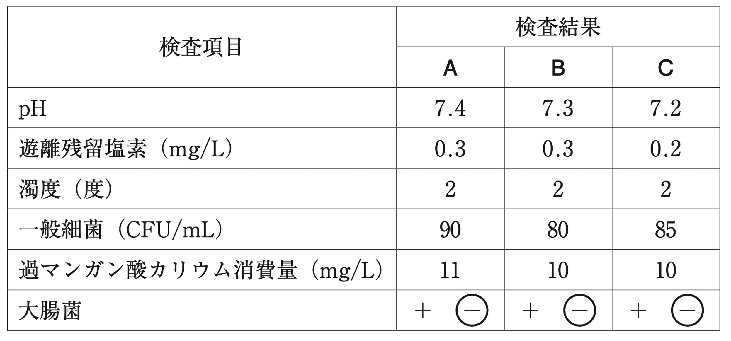 採水は図中の3点(A、B、C)、水面下20cmで、プール使用開始前に実施した。一部の検査は外部の検査機関に依頼した。今回の定期水質検査の結果は下表のとおりであった。
