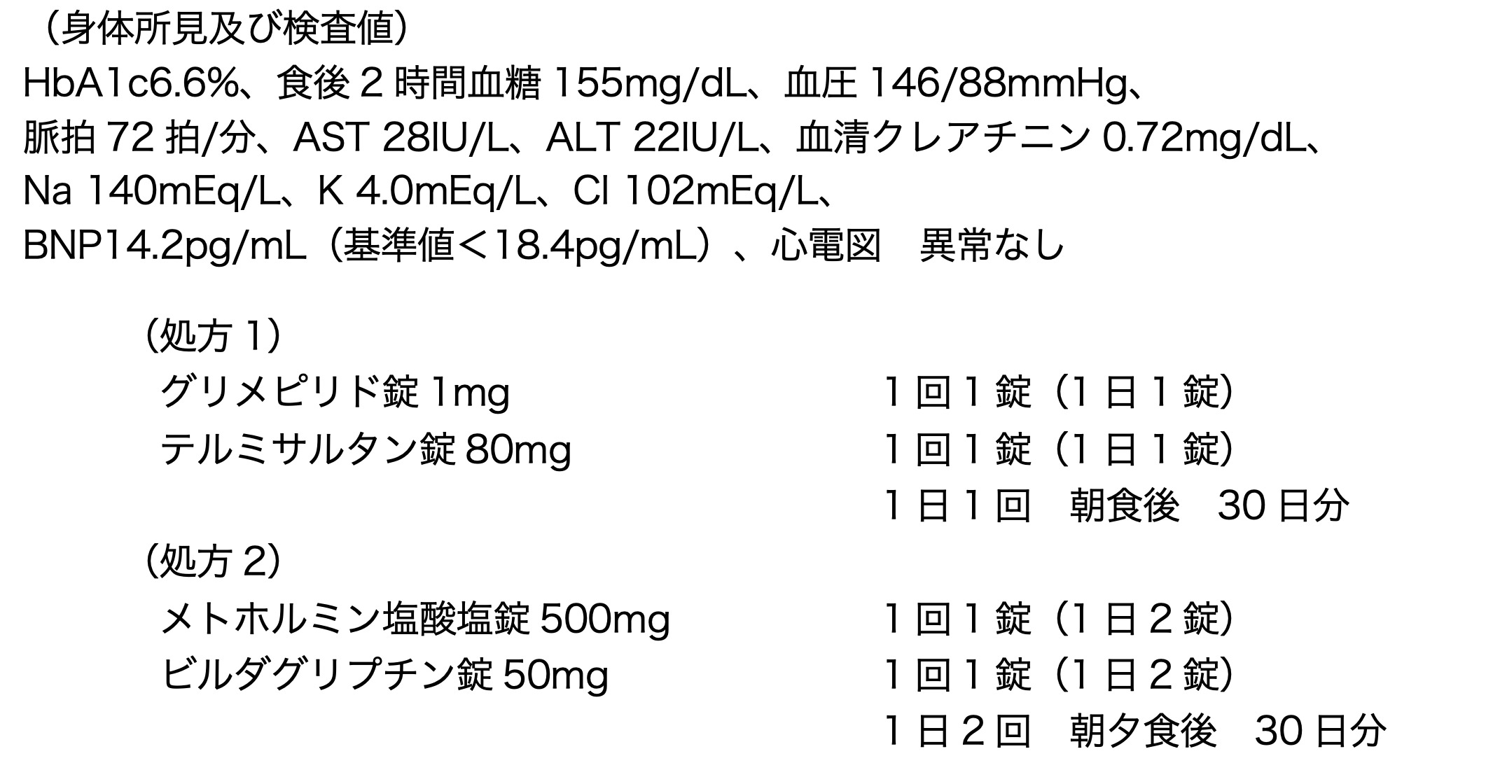 50歳男性。身長170cm、体重72kg。2型糖尿病及び高血圧症で通院しており、以下の薬剤を1年以上、継続的に服用している。本日、患者が処方箋を持って薬局を訪れた。