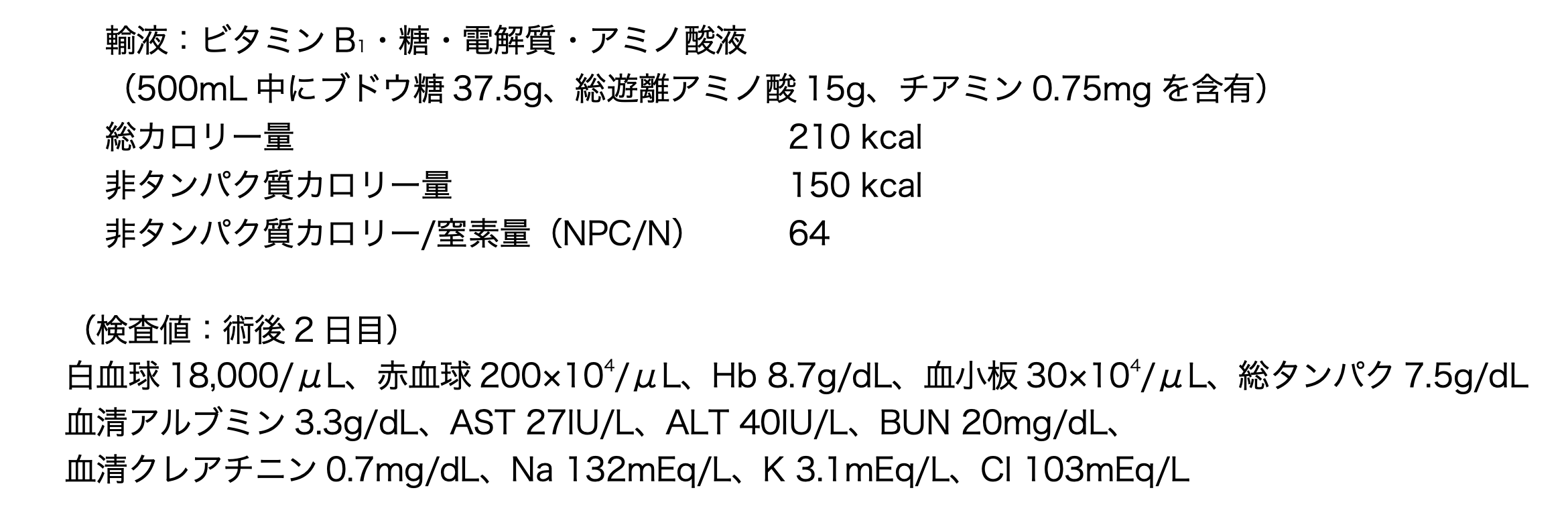 56歳男性。身長175cm体重52kg。肝細胞がんに対し、腹腔鏡下肝切除術を施行後であり、末梢静脈輸液にて栄養管理している。現在、以下の輸液を1日3回末梢静脈から投与している。なお、本輸液はダブルバッグ製剤であり、成分が2室に分けられている。術後2日目の検査値より、カリウム製剤(L-アスパラギン酸カリウム注射液10mEq/10mL、1アンプル)、及び静注用脂肪乳剤(イントラリポス輸液20%100mL、1バッグ)を追加することとなった。
