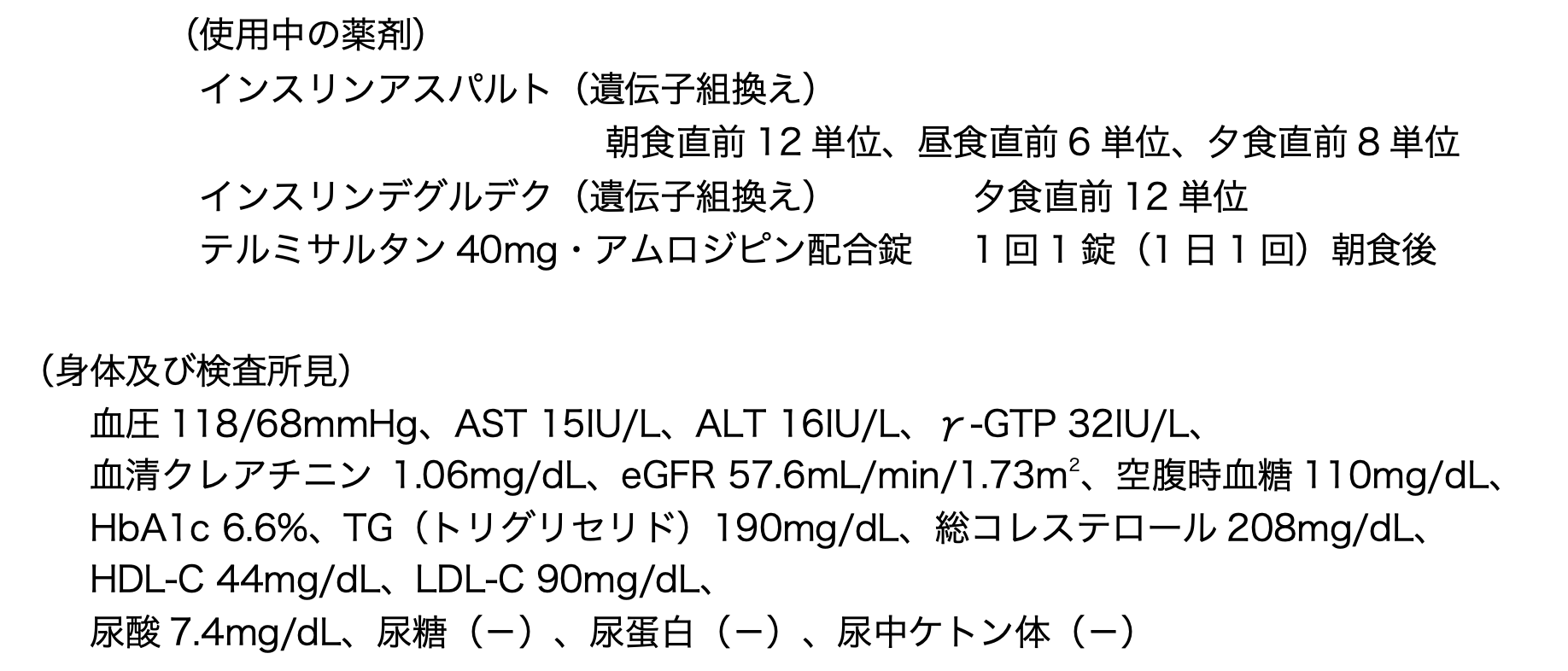 今回の身体所見と検査結果を基に、糖尿病合併症や併存症の進展の防止のために、追加が望ましい薬物はどれか。2つ選べ。