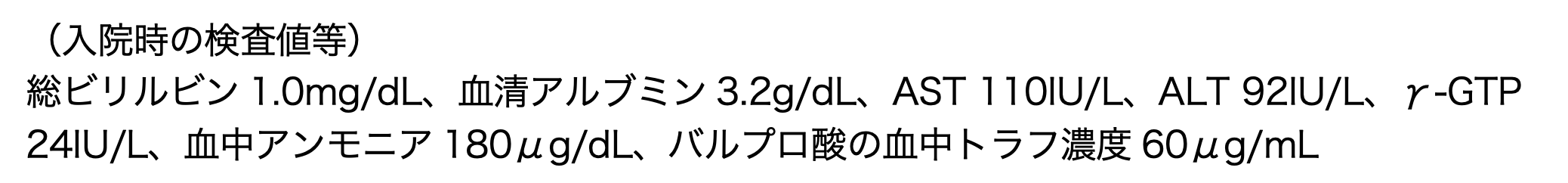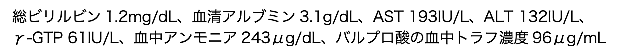 入院後、高アンモニア血症に対してラクツロースシロップの投与が開始されたが、3日後、食欲の低下、意識レベルの低下が悪化しつつあると小児科担当の薬剤師が主治医に報告した。そこで、血液検査を実施したところ、以下のとおりであった。