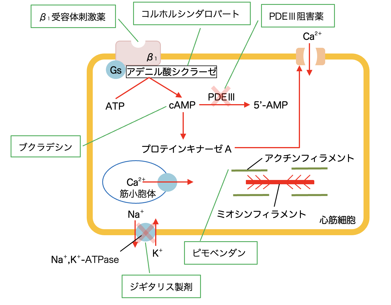 コルホルシンダロパートは、心筋および血管平滑筋において、アデニル酸シクラーゼを直接活性化し、cAMP濃度を上昇させることにより心筋収縮力を増大させるとともに血管拡張作用を示し、後負荷を軽減する。