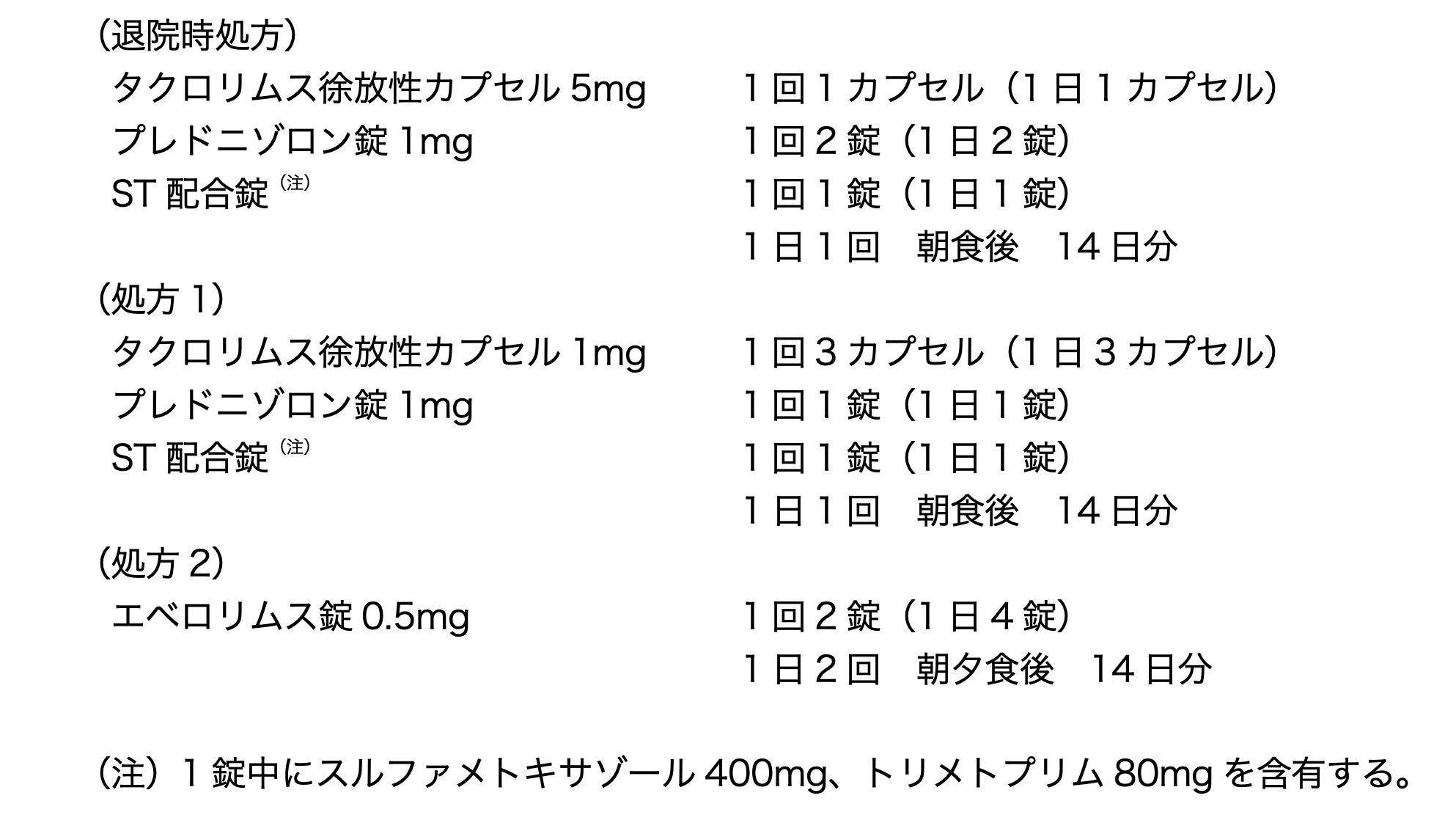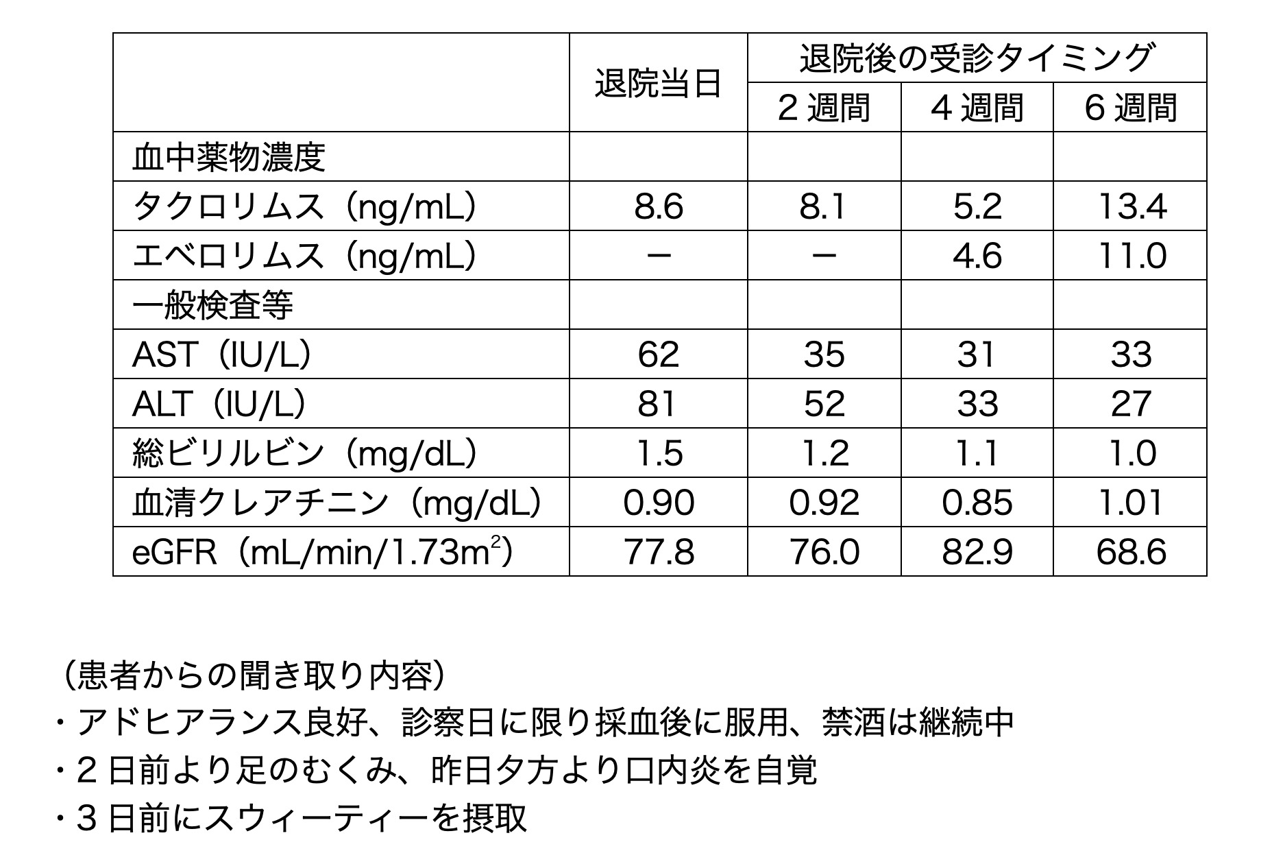 36歳男性。身長172cm、体重61kg。アルコール性肝硬変による末期肝不全に対して、妻をドナーとして生体肝移植術が施行された。術後4週間で退院し、退院2週間後1回目の診察において、退院時処方は処方1に変更されるとともに処方2も追加された。退院6週間後3回目となる今回の診察において、タクロリムス及びエベロリムスの血中濃度が前回に比べて上昇していた。退院当日から今回までの検査値等の推移と患者からの今回の聞き取り内容を示す。