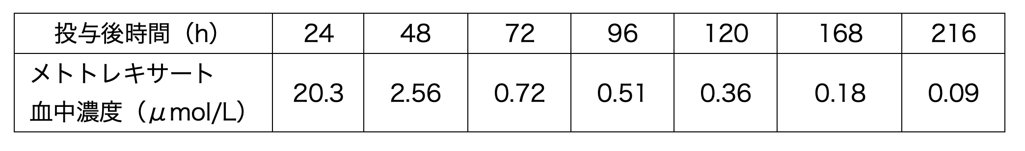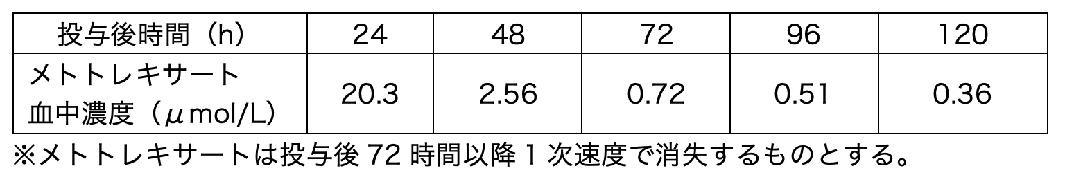 悪性リンパ腫に対してリツキシマブ、メトトレキサート・ホリナート救援療法を実施した。メトトレキサート投与後の時間ごとの血中濃度は下表のとおりである。メトトレキサートの72時間後の血中濃度が、重篤な副作用が発現する危険性が高い0.1μmol/Lを超えていたためホリナート投与を継続している。この患者の血中メトトレキサート濃度が0.1μmol/L未満となるのは投与何日後と推測されるか。1つ選べ。