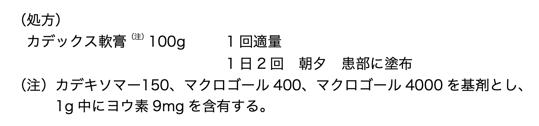 75歳男性。身長165cm、体重55kg。3年前に発症した右脳梗塞の後遺症のために、左半身麻痺があり、通院にてリハビリを行っている。ベッド上で過ごすことが多く、自力による体位変換はほとんどできず、1日3回のオムツ交換を行っている。今回、肺炎の疑いにて緊急入院となった。入院後、褥瘡対策チームが回診を行ったところ、仙骨部に3×5cmの褥瘡を認めた。創面は黄色、皮下脂肪組織までの欠損があり、感染を伴う混濁した黄色の浸出液が多く認められた。そのため、以下の処方で治療が開始されることとなった。