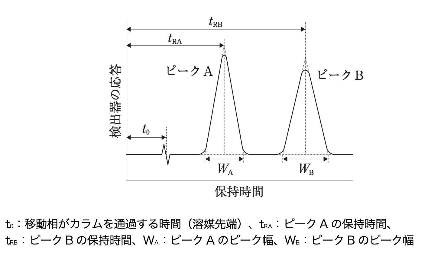 - ピークAとピークBの分離係数をαとすると、成分Aの質量分布比kAは成分Bの質量分布比kBのα倍である。