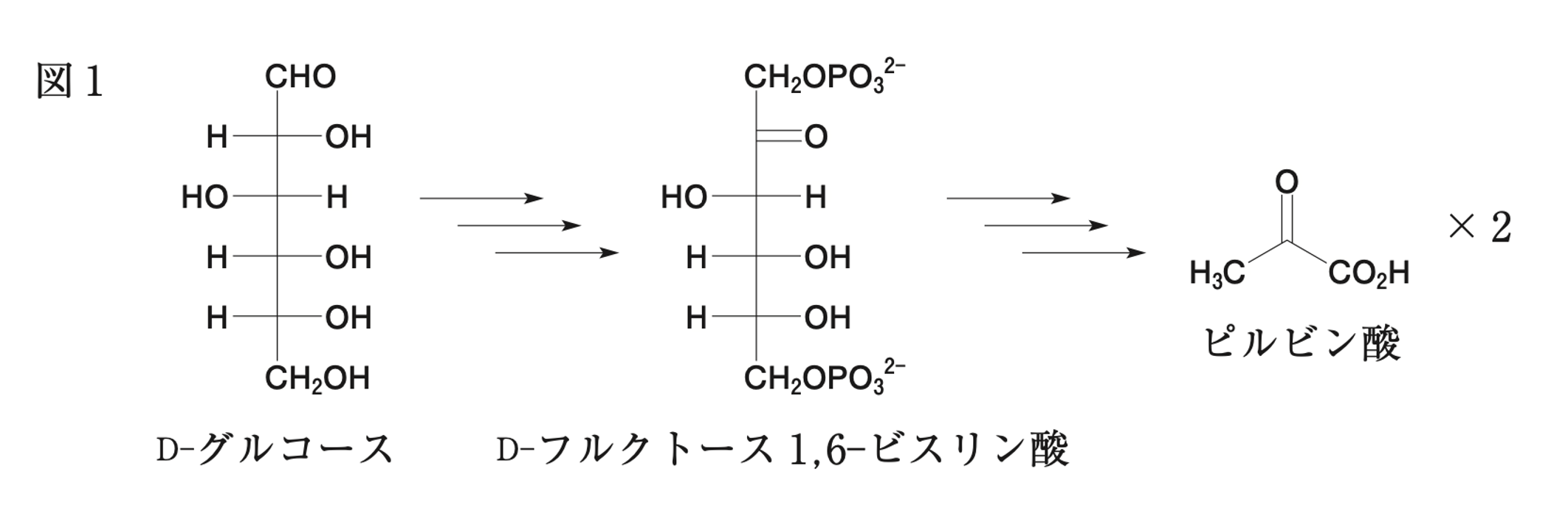 解糖系では、下の図のように、D-グルコースがD-フルクトース1,6-ビスリン酸へと変換されたのちに、2分子のピルビン酸へと分解される。