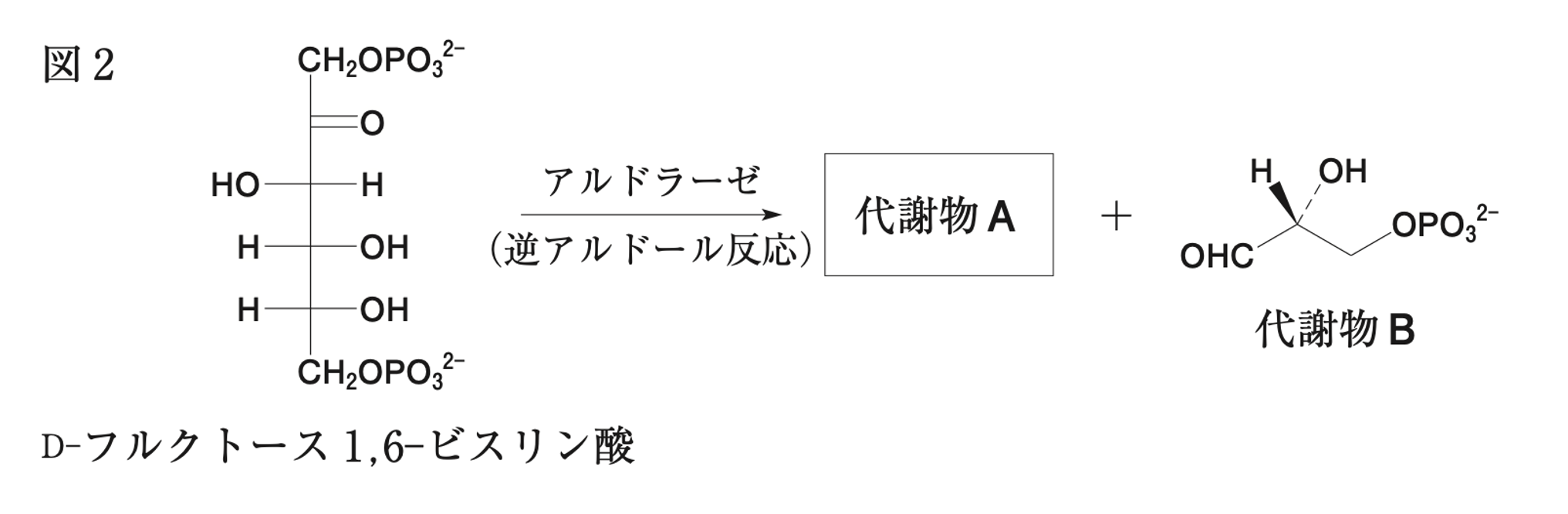 また、図2のように、D-フルクトース1,6-ビスリン酸は、アルドラーゼによって、代謝物AとBへ変換される。この反応はアルドール反応の逆反応である。