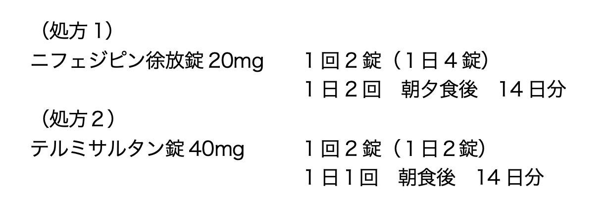 本症例では、Ca拮抗薬であるニフェジピン、ARBであるテルミサルタンを併用していることから、Ca拮抗薬(アムロジピンベシル酸塩)、ARB(イルベサルタン)を追加することは不適切である。アメジニウムは本態性低血圧に用いる薬であり、また、シベンゾリンは不整脈に用いる薬であることから追加するのは不適切である。上記のことより、ドキサゾシンメシル酸塩を追加投与することが適切である。
