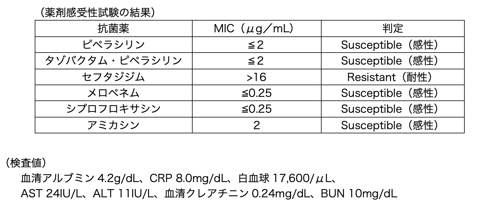抗菌薬終了7日後に、再び38°Cの発熱及び熱傷創部に膿を認めた。膿を検査したところ、【A】が同定された。検出された【A】の薬剤感受性試験及び患者の血液検査の結果は、以下のとおりである。