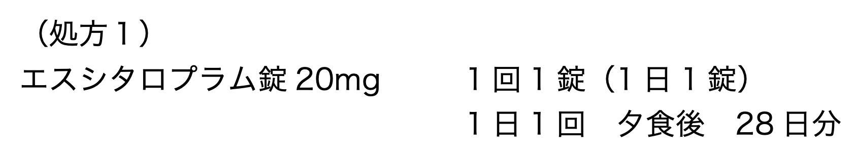 50歳男性。会社員。人事異動で1年前に本社の営業課長を命じられた。しかし仕事に順応できず、ストレス、不安感及び過食が3ヶ月続いた。上司のすすめもあり心療内科を受診し、うつ病と診断され以下の処方1で治療中である。