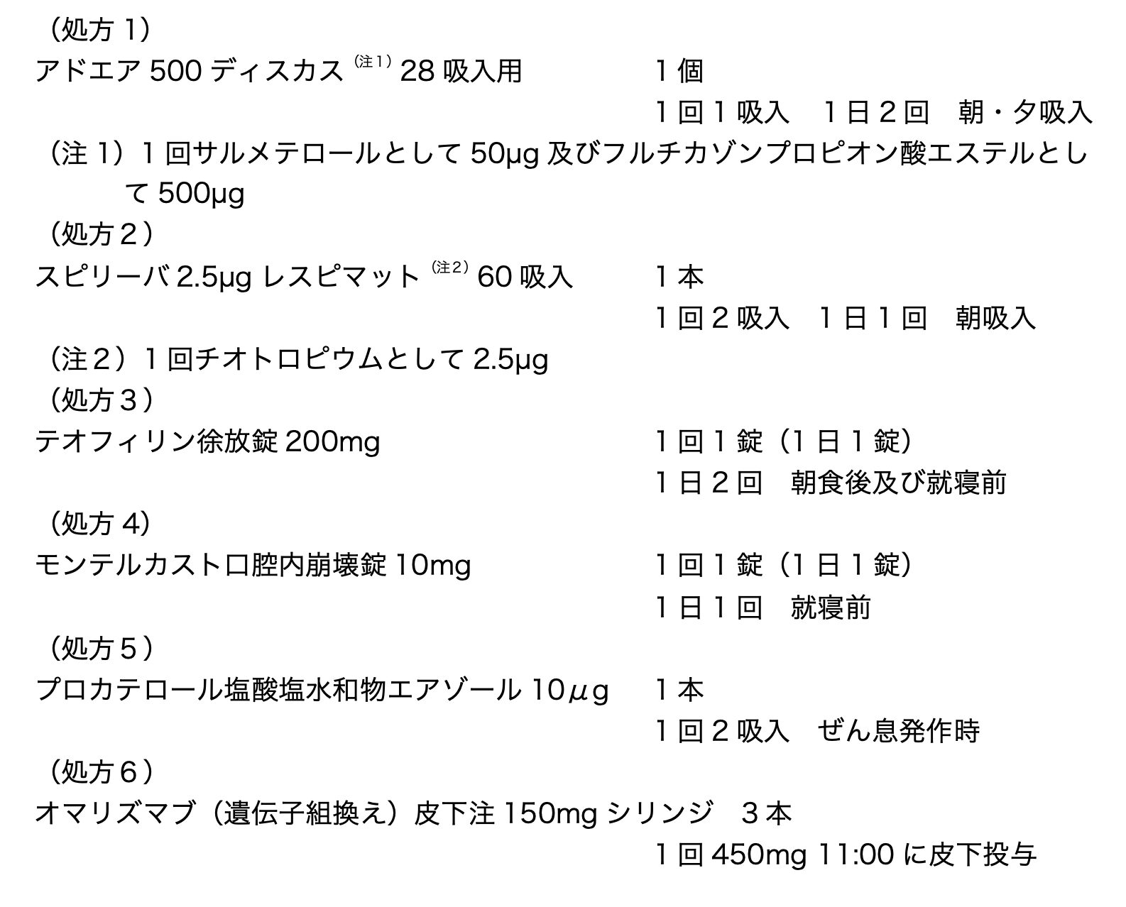 52歳女性。40歳時に気管支ぜん息と診断された。現在、処方1〜5の薬剤を服用しており、アドヒアランスは良好であるが、ぜん息発作で頻回に入院していた。今回、ぜん息発作のコントロール目的で入院となり、処方6が追加された。