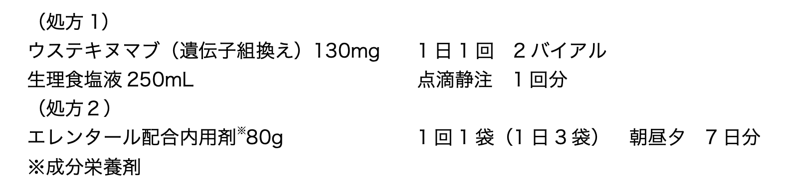 25歳女性。身長153cm、体重40kg。19歳のときにクローン病と診断され、メサラジンとアザチオプリンによる併用療法を実施していたが、効果不十分のため1年前よりアダリムマブ(遺伝子組換え)皮下注が追加となった。2週間前より、発熱、腹痛及び下痢があり検査目的で入院となった。内視鏡検査の結果、症状が悪化していることが分かり、アダリムマブが以下の処方1に変更されるとともに、処方2が追加された。