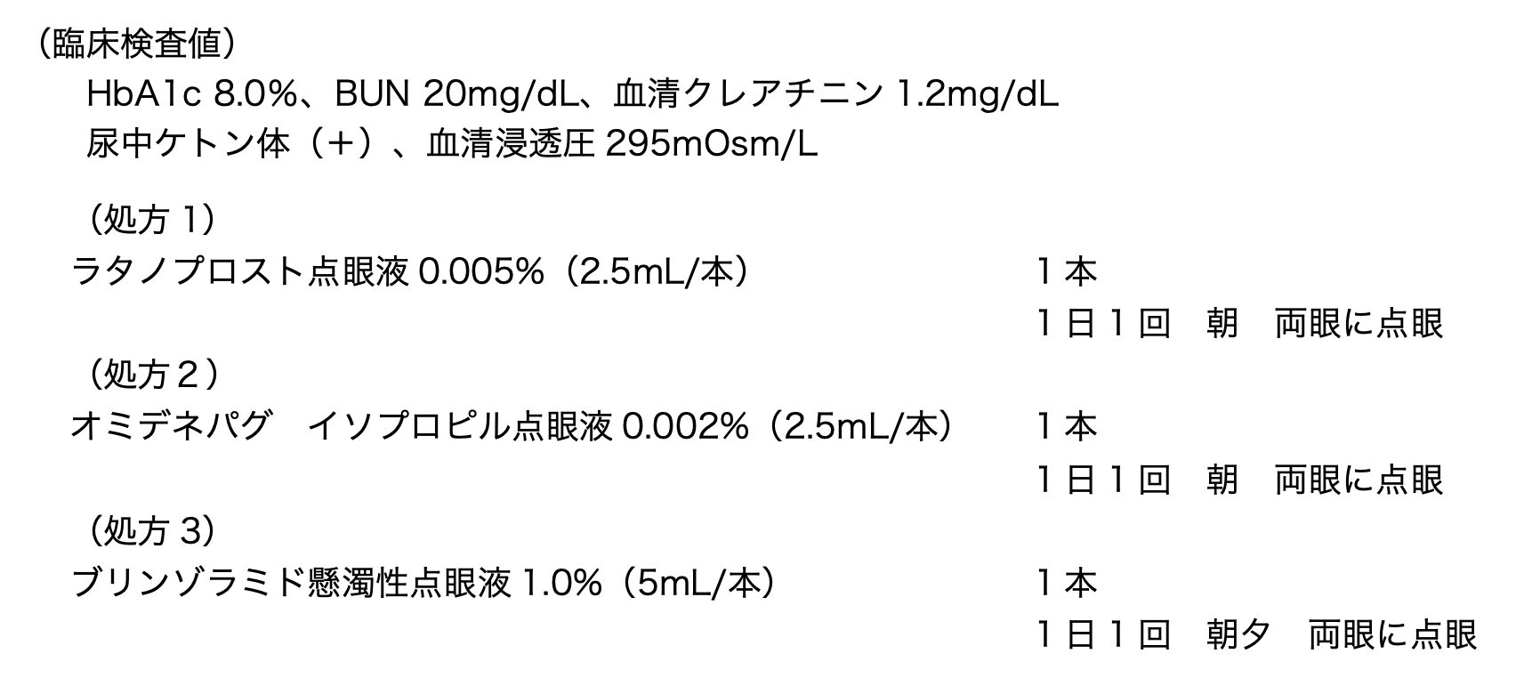 70歳男性。糖尿病と心不全で治療中。3年前に眼圧の上昇が指摘され、原発開放隅角緑内障との診断を受け、処方1による治療を開始した。なお、同時に白内障の診断も受けている。点眼液による治療開始後、目の周囲が黒ずむなど眼瞼色素沈着が観察されるようになったため、処方1から処方2へ変更になった。その後、眼圧低下が不十分と診断され、現在は処方2に加えて処方3が追加となっている。