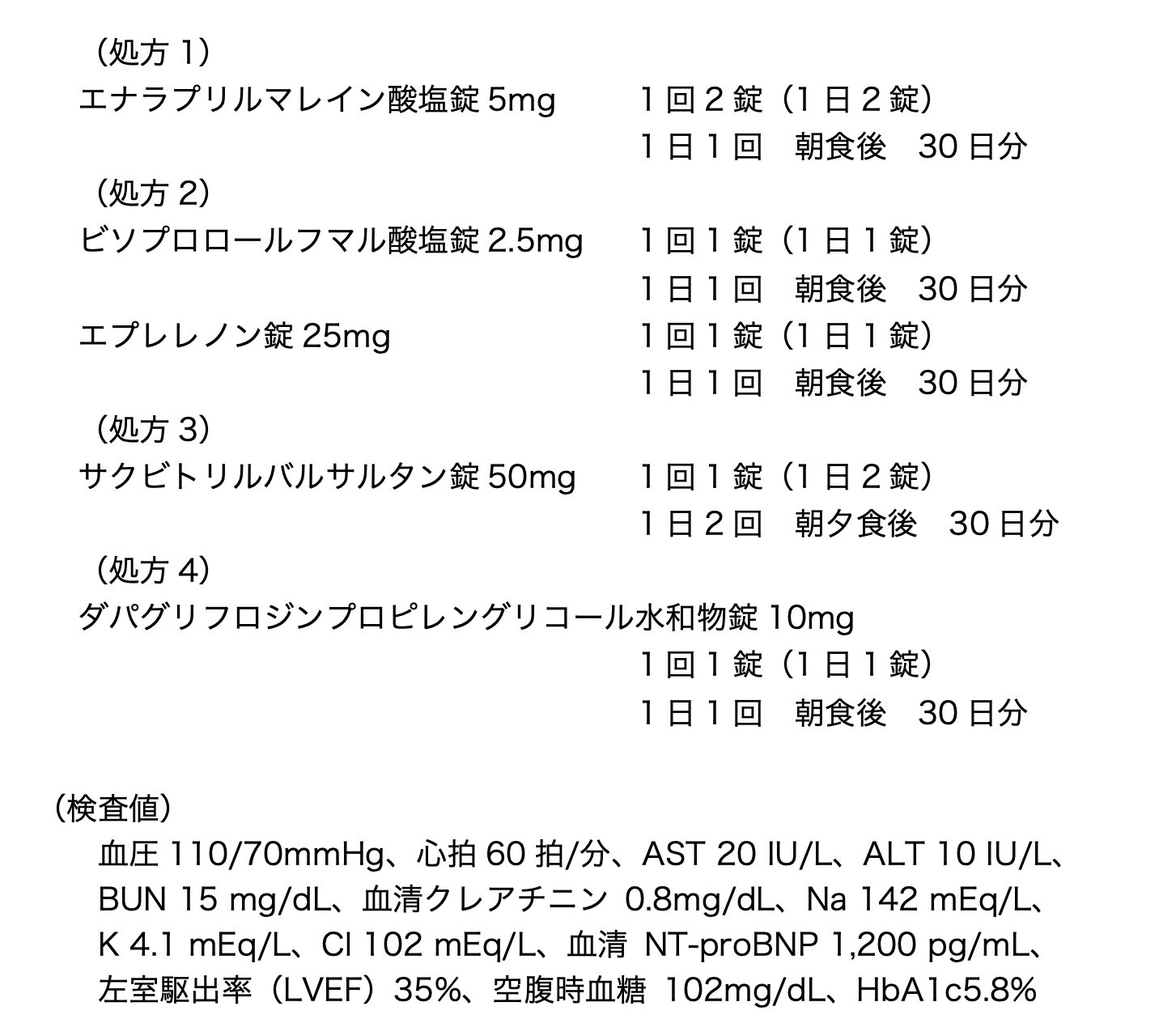79歳女性。3年前、階段を昇る時に息切れを感じるようになり受診したところ、胸部レントゲン写真で心拡大と肺うっ血を認め、心エコー検査等の結果、慢性心不全と診断された。処方1と処方2で治療されていたが、慢性心不全の増悪により入院した。その後、処方1を処方3へ変更し目立った副作用なく病態が安定した。医師は検査値等を確認し、さらに処方4を退院時に追加し退院することになった。退院時の検査値等は以下のとおりである。