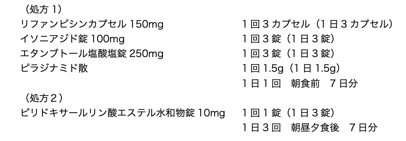 38歳男性。身長175cm、体重65kg。腎機能及び肝機能は正常。仕事で海外出張が多く疲労気味だった。帰国後、37°C台の微熱と痰がからむ咳が2週間続き、近医を受診した。胸部X線検査の結果、肺に空洞を伴う結節性陰影を認めたため総合病院を紹介受診し、諸検査を受けたところ肺結核と診断された。