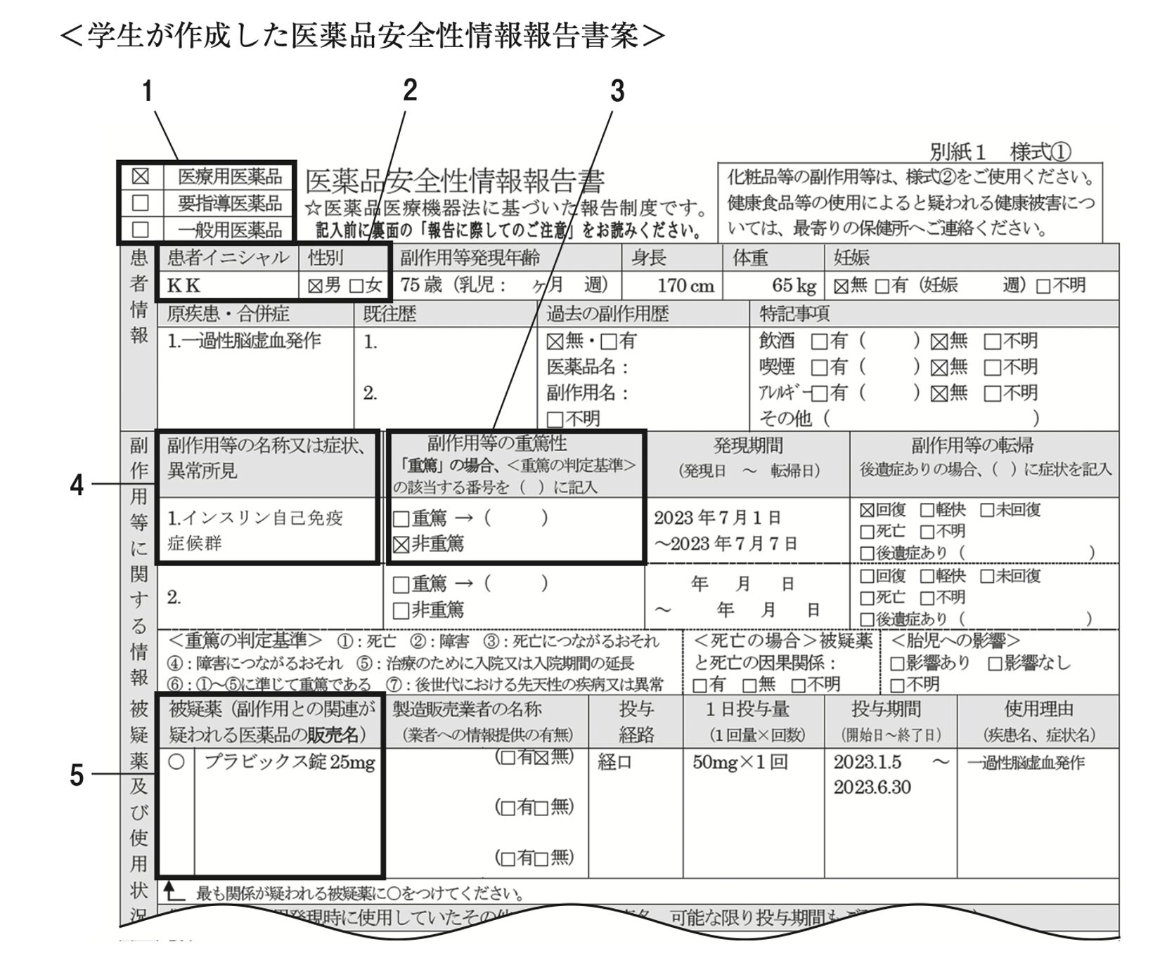 厚生康太(こうせいこうた)氏、75歳男性。身長170cm、体重65kg。一過性脳虚血発作で入院し、再発予防目的でプラビックス錠(注)25mgが1回2錠、1日1回の処方で服薬開始となった。 2023年7月1日に起床時のふらつきと意識障害をきたし、近医へ救急搬送され、 緊急入院となった。入院時の血糖値33mg/dL、入院翌日の空腹時血糖値14mg/dL、血中インスリン濃度127.5 μIU/mL(基準値2.7〜10.4)であった。プラビックス錠は入院直後に中止された。検査の結果、患者はプラビックス錠の副作用であるインスリン自己免疫症候群と診断された。入院7日後には検査所見、自覚症状ともに改善した。薬剤師は医薬品・医療機器等安全性情報報告制度に基づき、医薬品安全性情報報告書を作成するとともに、実務実習中の薬学部学生にも報告書の作成の練習をしてもらうこととした。