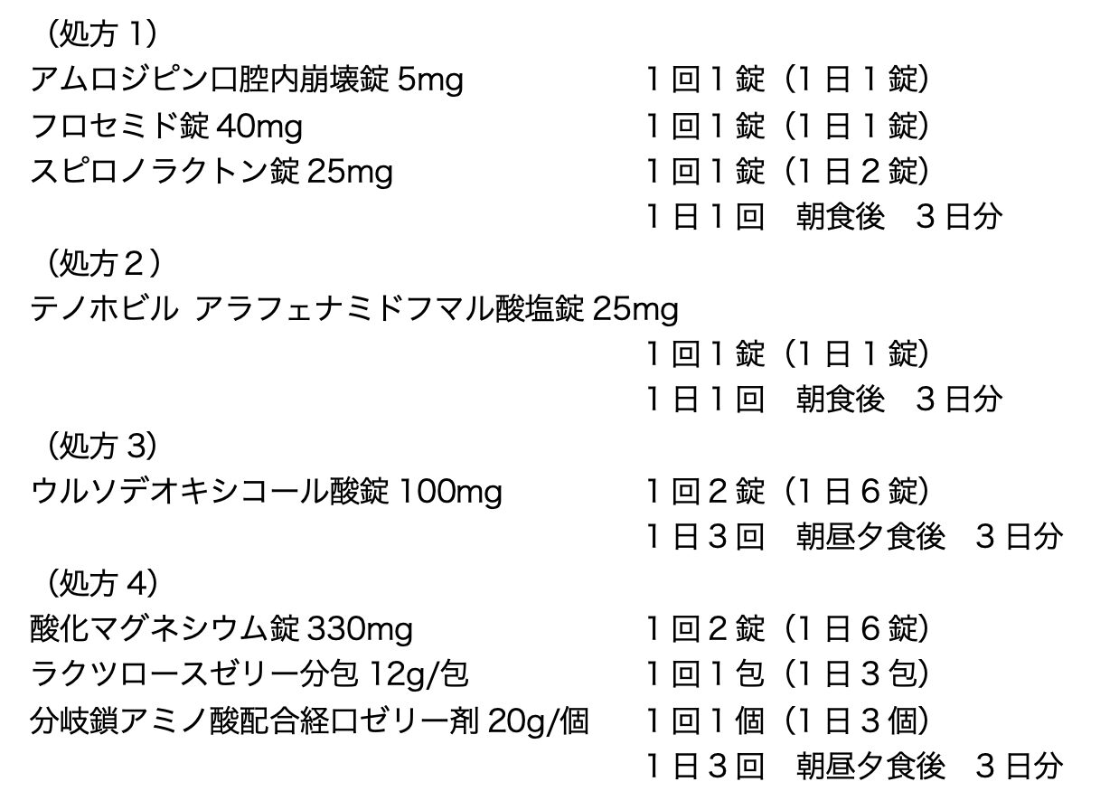 65歳男性。30年前の検査でB型肝炎ウイルス(HBV)陽性であったが、症状もなく長年未治療のまま放置していた。最近になり、倦怠感、腹部膨満感及びめまい、ふらつきが強くなり、家族に連れられて受診したところ、非代償性肝硬変と診断を受け緊急入院となった。検査の結果、腹水が観察され血圧も高値であり、内服薬が開始されることになった。患者は日頃より便秘を訴えており、現在、食事は可能であるが摂取量が減ってきている。また、血中アンモニアが198μg/dLと高値を示している。以下が入院後の処方である。