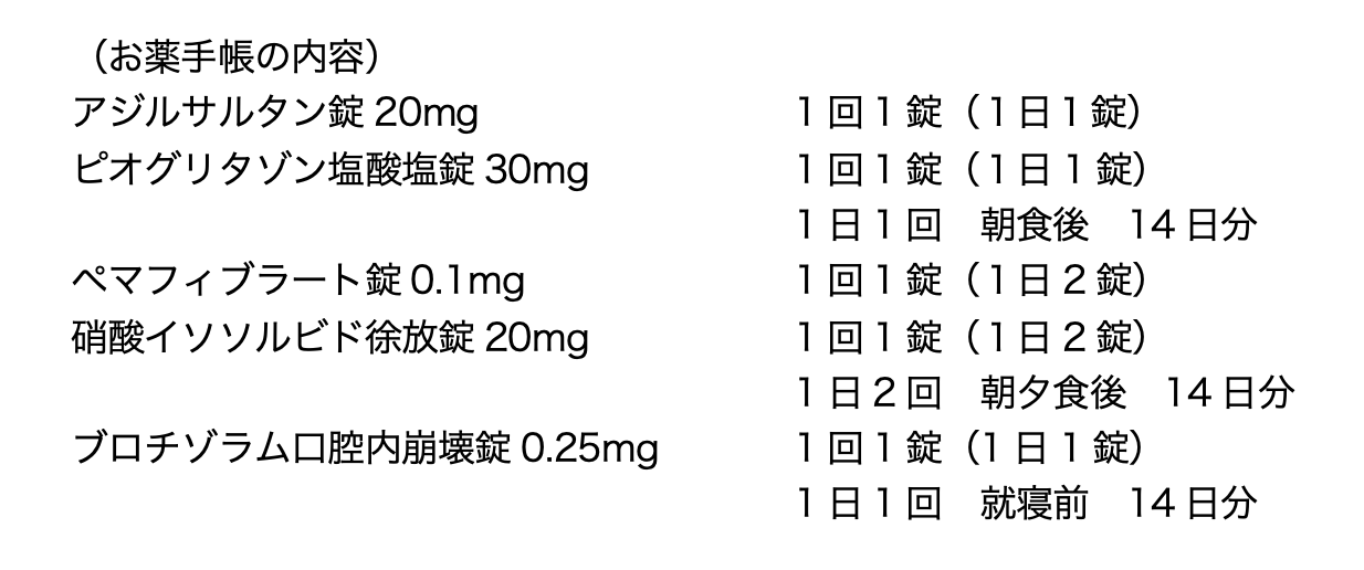 74歳女性。友人と一緒に地域の健康フェアに参加した際に、お薬相談コーナーを訪れた。女性の話によると、過去10年以上治療してきており、今の5剤になったのは半年前である。最近、足のむくみと体重増加が気になっているとのことであった。薬剤師は、女性が持参したお薬手帳より、以下の薬剤を服用中であることを確認している。