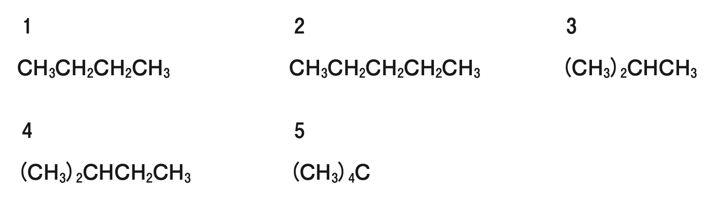 アルカンの沸点は、分子の間に働く分散力と相関性を示す。一般に、アルカンにおける分散力は同圧下では、炭素数が多くなるほど強くなり、同じ炭素数では分岐鎖が増えるほど弱くなる。よって、選択肢のうち、同圧下で沸点がもっとも高いのは、炭素数が最も多く直鎖構造を有するCH3CH2CH2CH2CH3である。