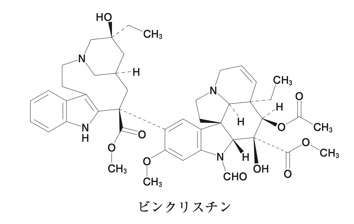 ビンクリスチンは、キョウチクトウ科植物ニチニチソウから得られるインドールアルカロイド系の抗がん剤である。構造中にインドール環を有しており、このインドール環の起源となるアミノ酸がトリプトファンである。したがって、トリプトファンはビンクリスチンの生合成における重要な前駆体となる。