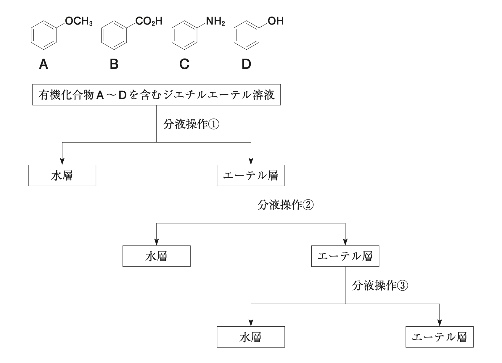 有機化合物A~Dが100mgずつ含まれるジエチルエーテル(エーテル)溶液100mLについて、エーテルと同体積の各水溶液を用いて、分液ロートによる以下の操作を行った。このとき分液操作②によって得られた水層には、有機化合物Dの塩が主に含まれていた。有機化合物A〜Dを分離する分液操作の組合せとして、最も適切なのはどれか。1つ選べ。
