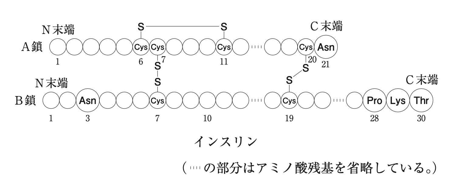 下図は、インスリンの構造を模式的に示している。図中の○はアミノ酸残基を示し、特徴のあるアミノ酸残基を3文字表記している。