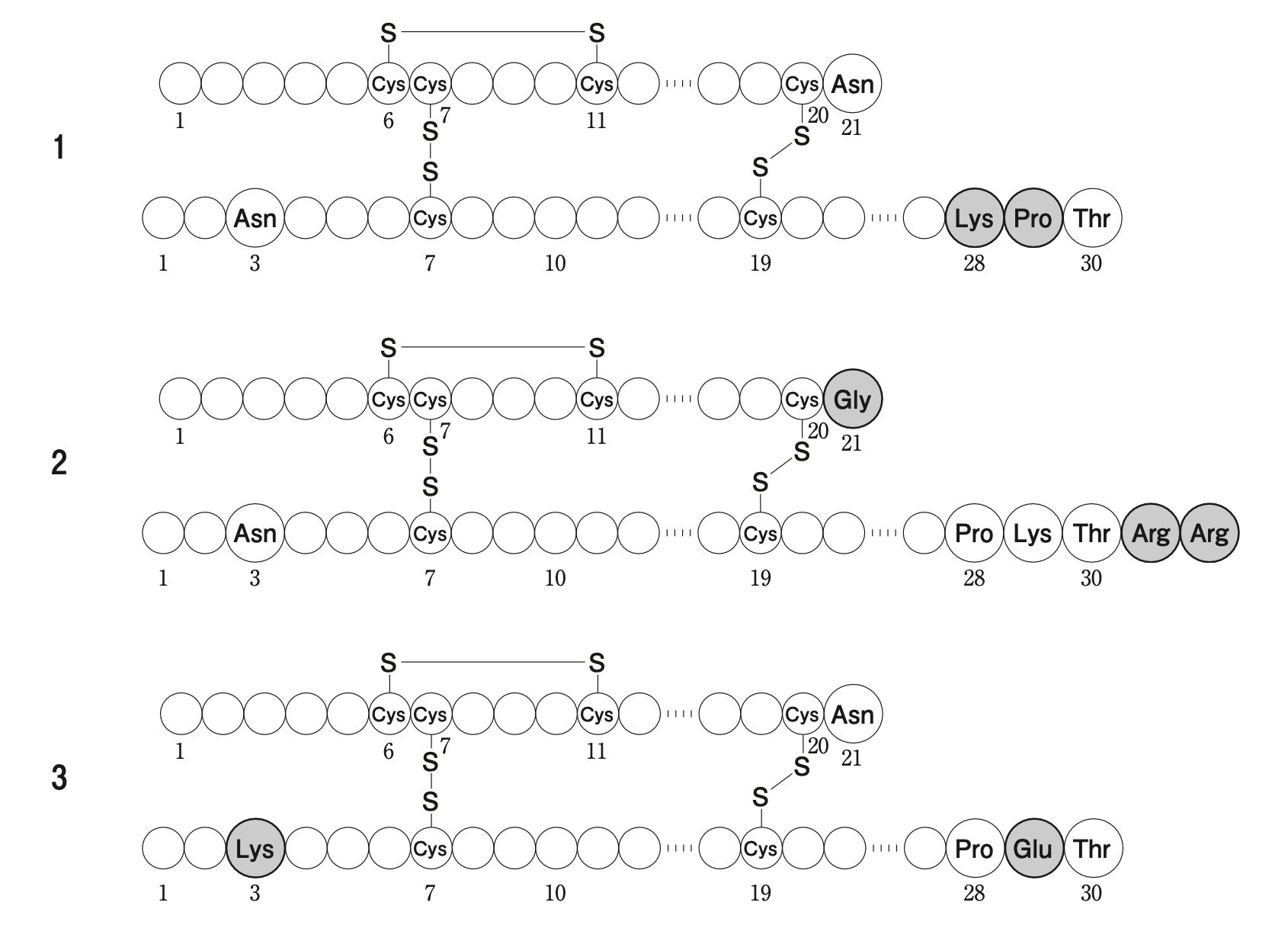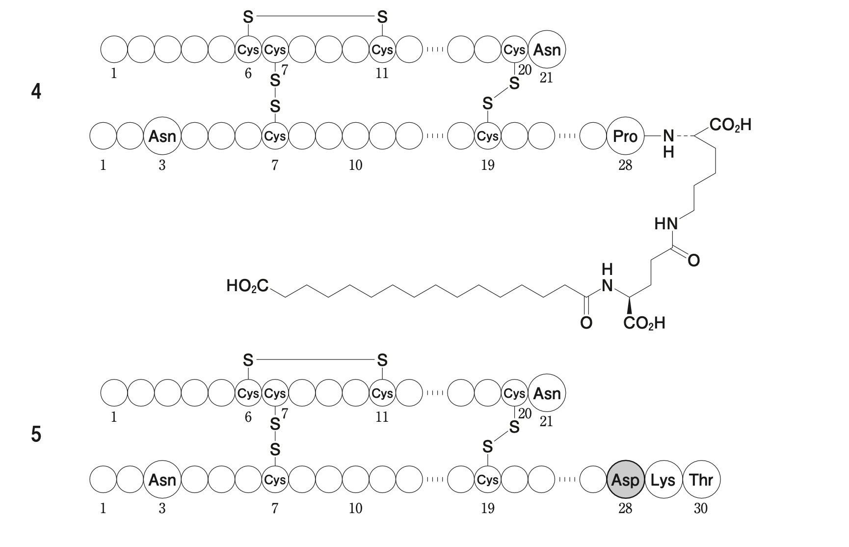 近年、インスリンの化学構造を部分的に改変することで、治療目的に沿った血糖降下作用を発揮するインスリンアナログ製剤(1~5)が開発されている。このうち、構造改変によりインスリンの等電点(pI約5.4)を中性付近(pI約6.7)に近づけることにより、生理的pHで等電点沈降を起こし、皮下で徐々に溶解、吸収され、1日1回の皮下投与で安定した血糖降下作用を示すのはどれか。1つ選べ。なお、各アナログ製剤の構造はインスリンと同様の方法で図示しており、図中の○はインスリンと異なるアミノ酸残基を示す。