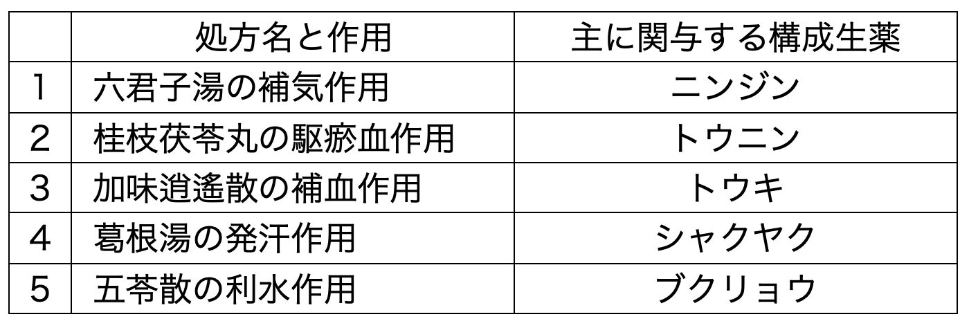 以下の漢方処方が示す作用と、それに主に関与する構成生薬との組合せのうち、誤っているのはどれか。1つ選べ。