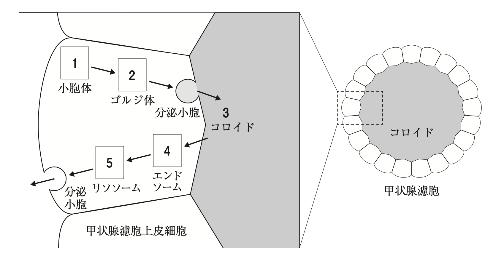 - ヨウ素化を受けたチログロブリンは甲状腺濾胞上皮細胞に再度吸収される。