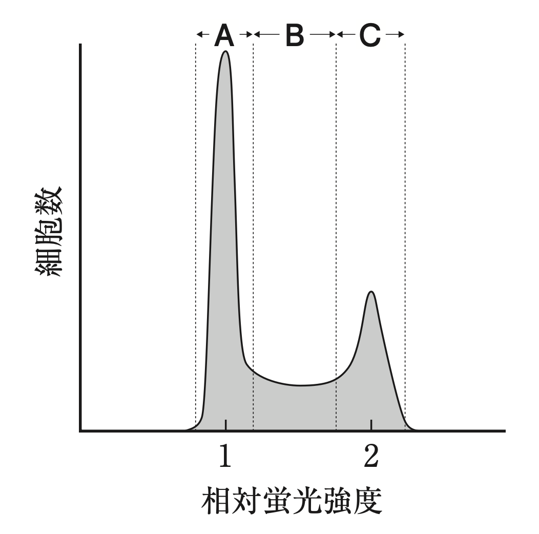 領域B:蛍光強度が中程度で、染色体の量が2n〜4nの範囲にある→S期