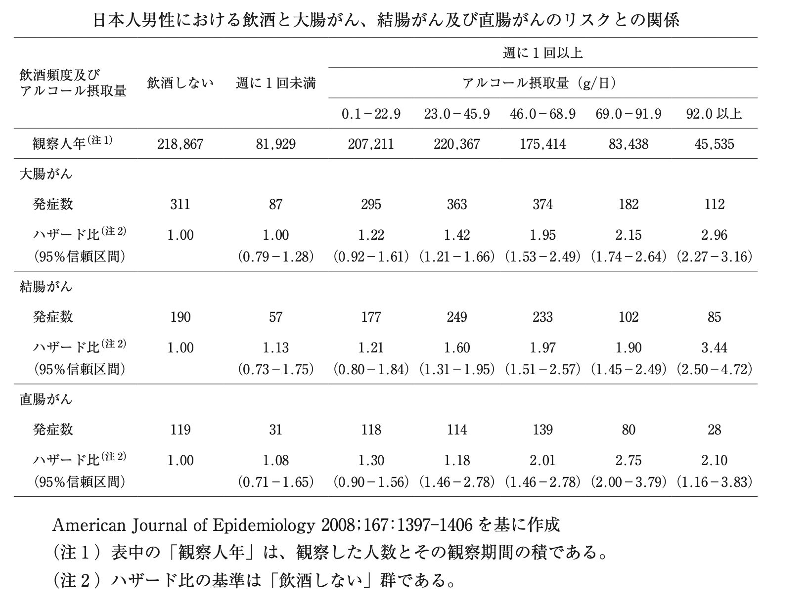 ただし、下表を基に算出した「飲酒しない群」の大腸がん発症率は10万観察人年当たり142人、「23.0g/日以上のアルコール摂取群」の大腸がん発症率は10万観察人年当たり196人である。