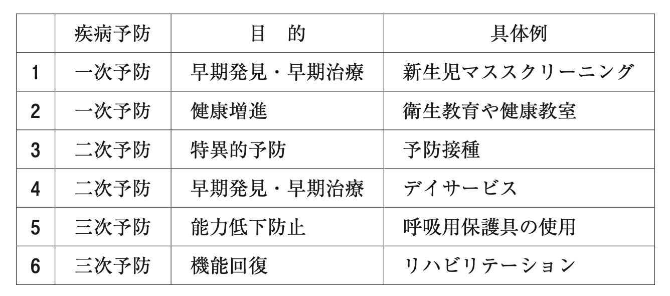 病気を早い段階で見つけ、速やかに治療を行うことは二次予防にあたる。一方、ワクチンなどによる予防接種は、病気そのものの発症を防ぐものであり、一次予防に分類される。