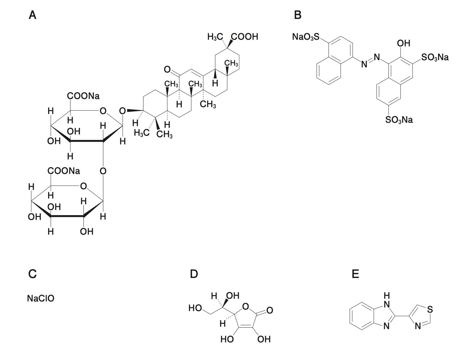 Dはエリソルビン酸であり、アスコルビン酸(ビタミンC)と類似構造をしている。Dはラジカル捕捉型の酸化防止剤として使用され、油脂の酸化を防止する目的で使用される。