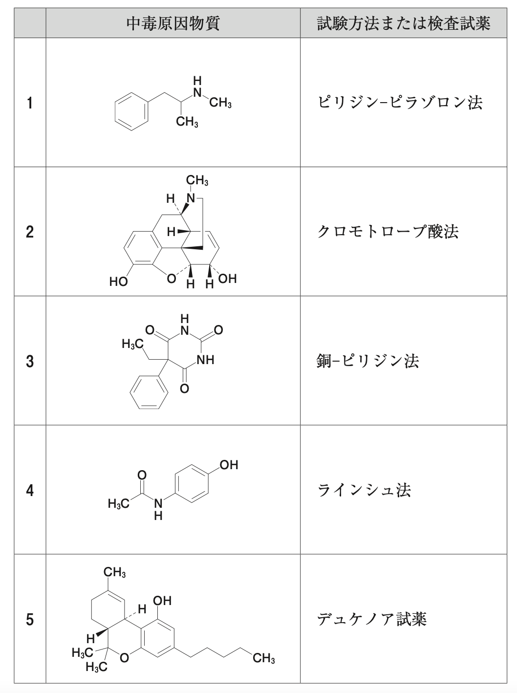 モルヒネの構造であり、検査にはマルキス試薬が用いられる。なお、クロモトロープ酸法はメタノールのスクリーニング試験である。
