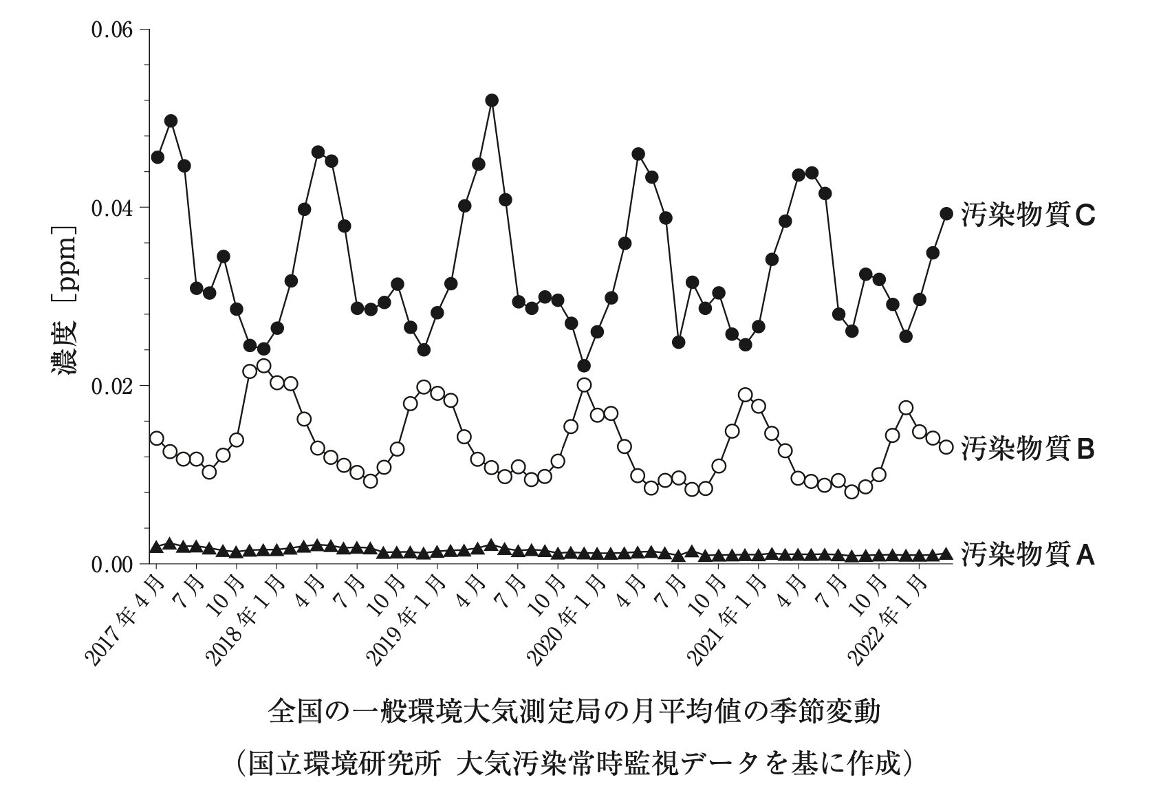 下図の汚染物質A~Cは、全国の一般環境大気測定局における窒素酸化物、二酸化硫黄又は光化学オキシダントのいずれかの季節変動を示したものである。汚染物質A~Cに関する記述のうち、正しいのはどれか。2つ選べ。