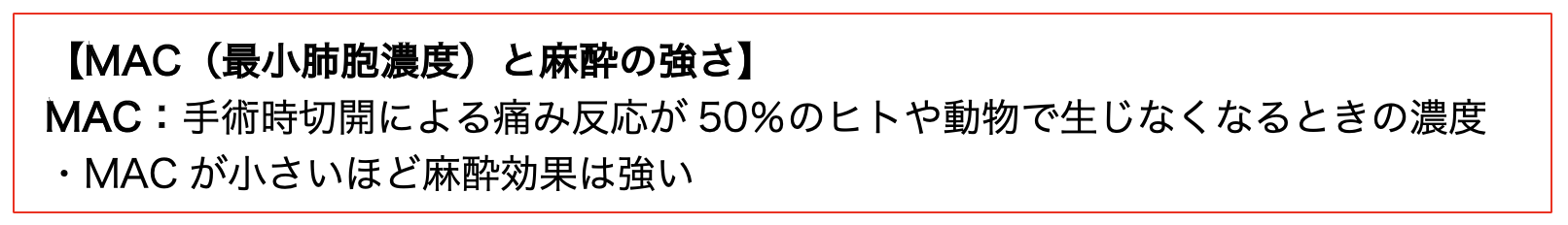 - 最小肺胞濃度(MAC)の大きい吸入麻酔薬ほど、麻酔作用は強い。