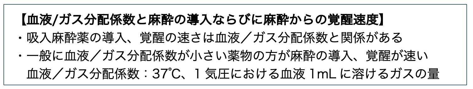 - 血液/ガス分配係数の大きい吸入麻酔薬ほど、麻酔の導入は速い。