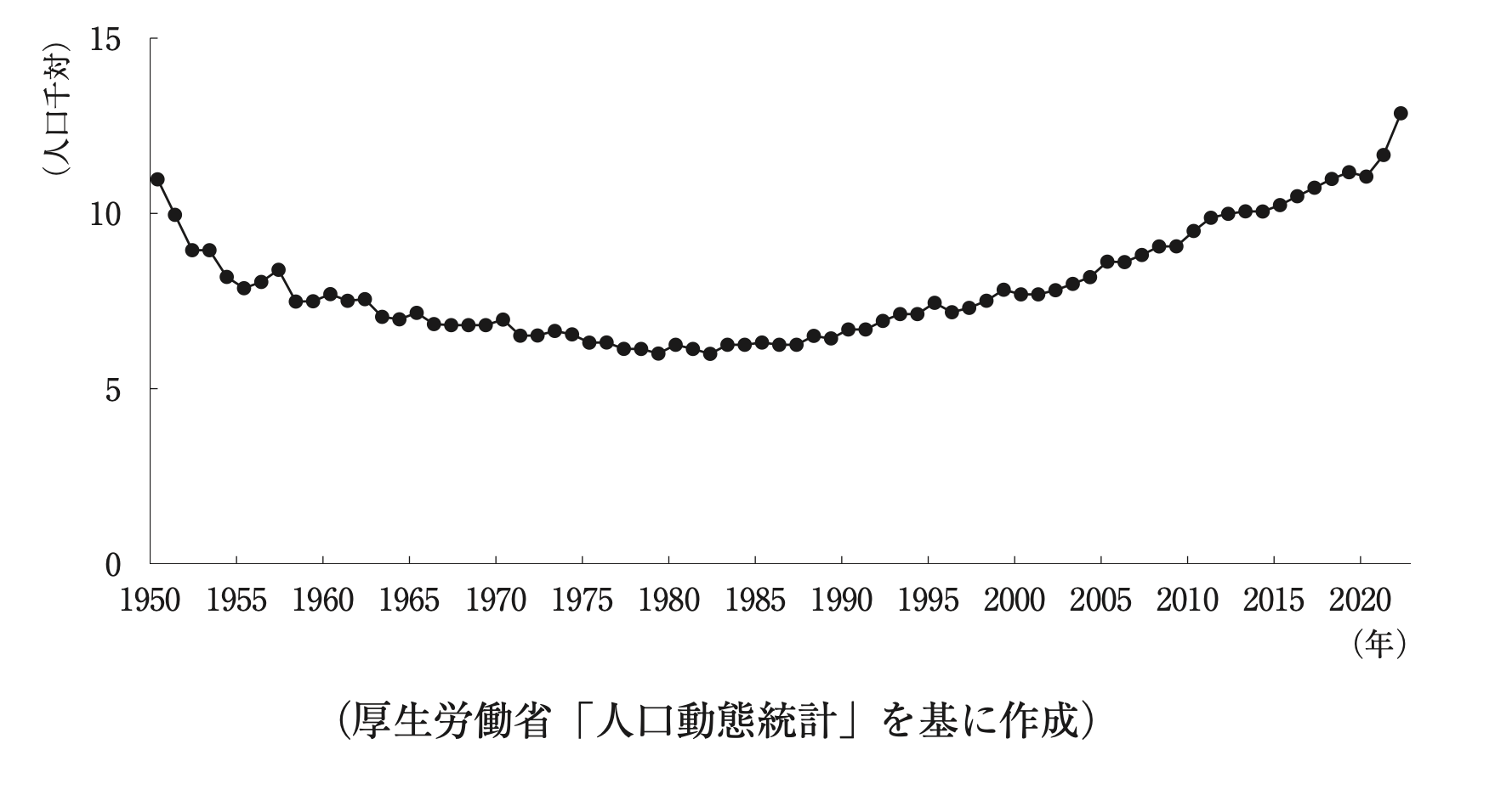 下図の年次推移を示す我が国の人口統計指標はどれか。1つ選べ。