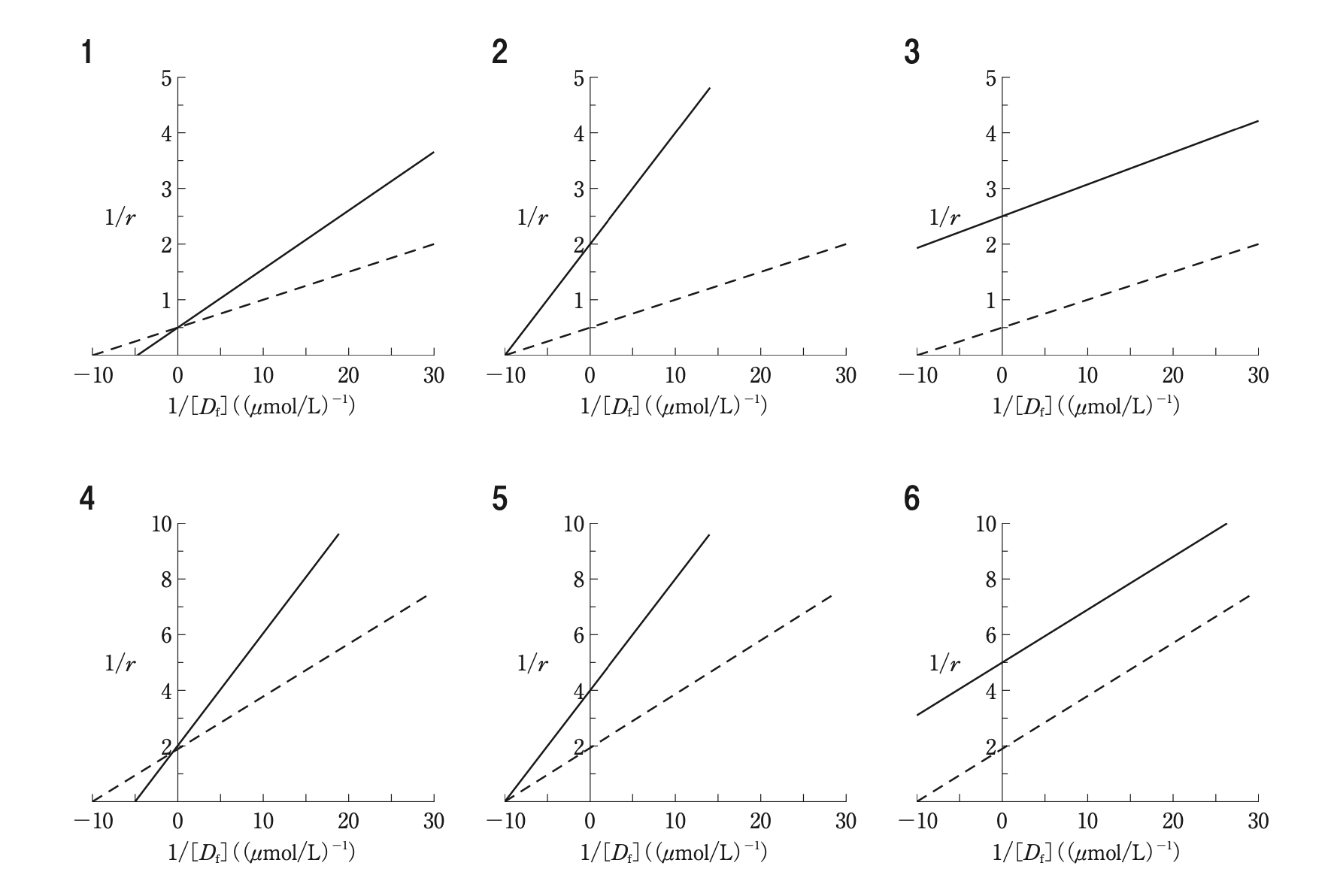 ある薬物のアルブミンへの結合定数は 10 (μmol/L)-1、結合部位数は2である。この薬物のアルブミン結合に関する両逆数プロットを点線で表し、また、この薬物のアルブミンへの結合が別の薬物の共存により競合的に阻害された場合を実線で表すとき、正しい図はどれか。1つ選べ。