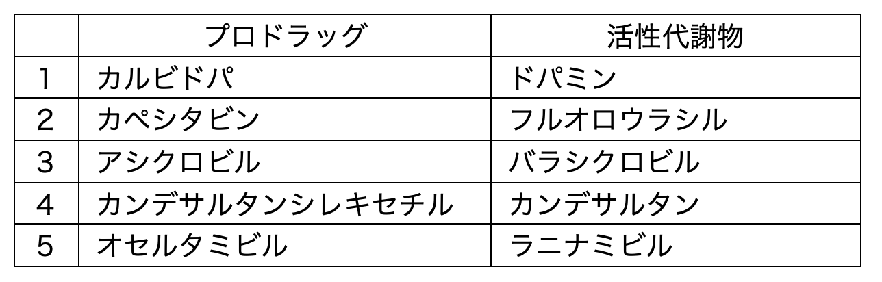 プロドラッグとその活性代謝物の組合せとして、正しいのはどれか。2つ選べ。