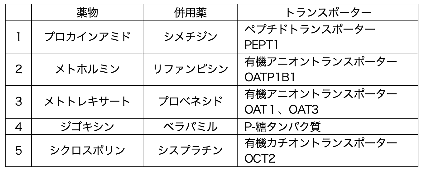 プロカインアミドとシメチジンは、主に腎尿細管上皮細胞の側底膜に存在する有機カチオントランスポーター(OCT2)を介して輸送される基質である。これらを併用すると、腎排泄過程における競合阻害により血中濃度が上昇する。