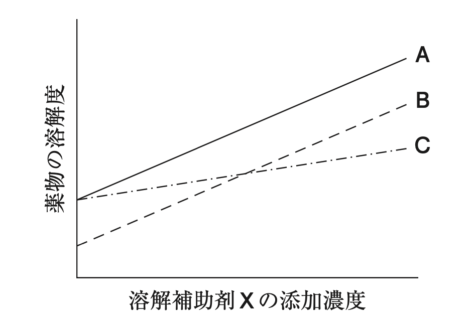 - 溶解補助剤を添加しないとき、薬物の溶解度の大小関係は、A=C>Bである。