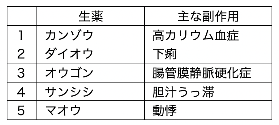 生薬とその主な副作用の組合せのうち、正しいのはどれか。2つ選べ。