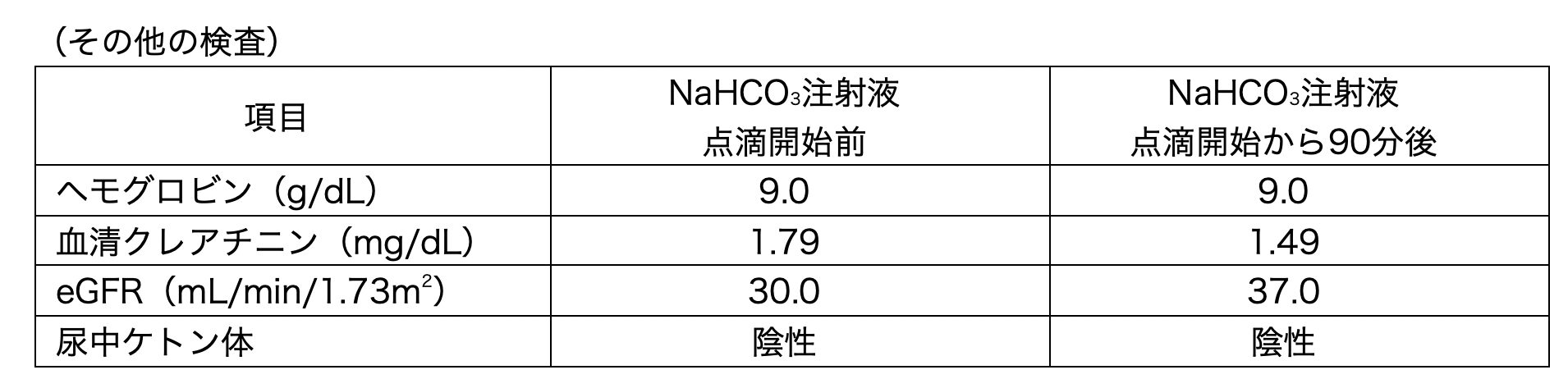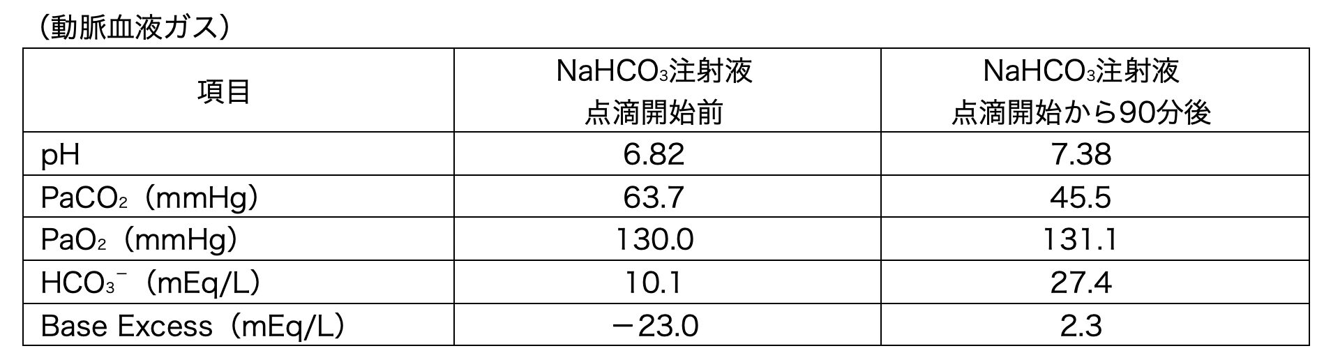 生理食塩液の持続投与下で動脈血液ガス等を確認した結果、医師は8.4w/v%炭酸水素ナトリウム(NaHCO₃)注射液の点滴を開始した。点滴開始から90分後に状態の改善を認めた。8.4w/v% NaHCO₃注射液点滴開始前と点滴開始から90分後の動脈血液ガス等は以下のとおりであった。