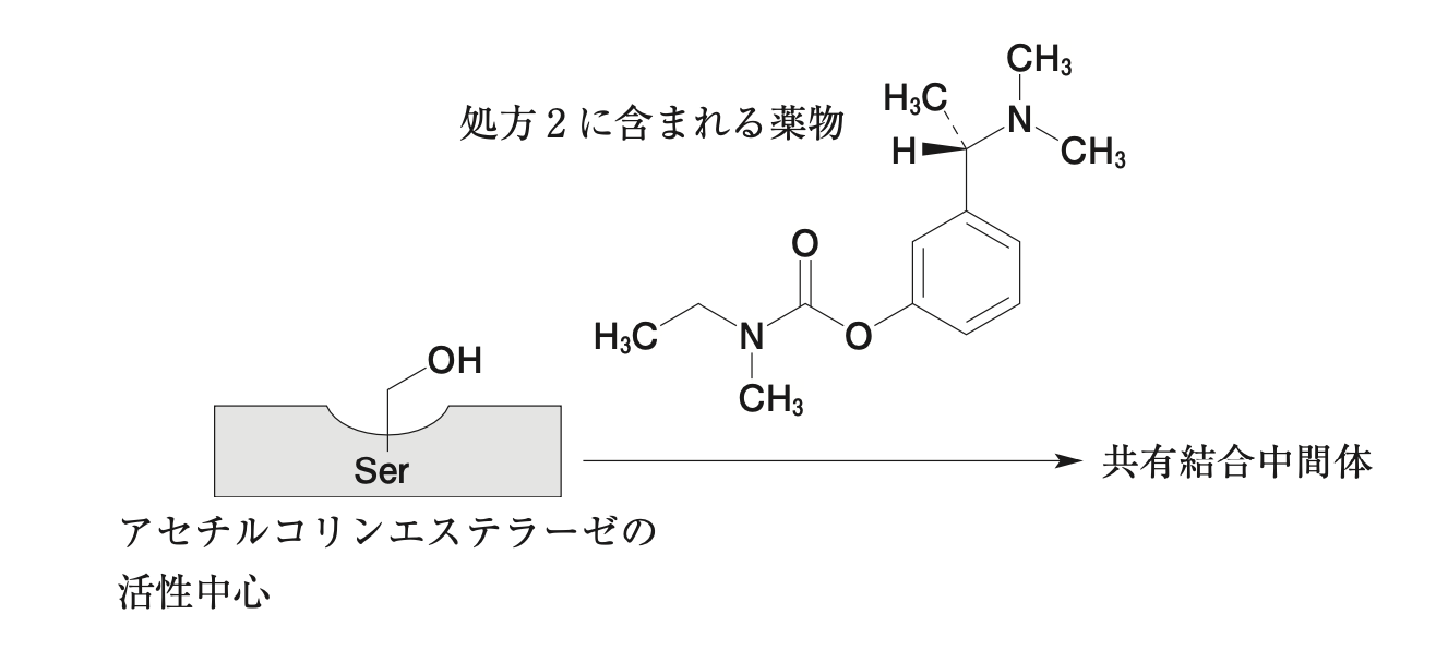処方2に含まれる薬物は、下図のように、アセチルコリンエステラーゼの活性中心のセリン残基と反応し、共有結合中間体を形成する。