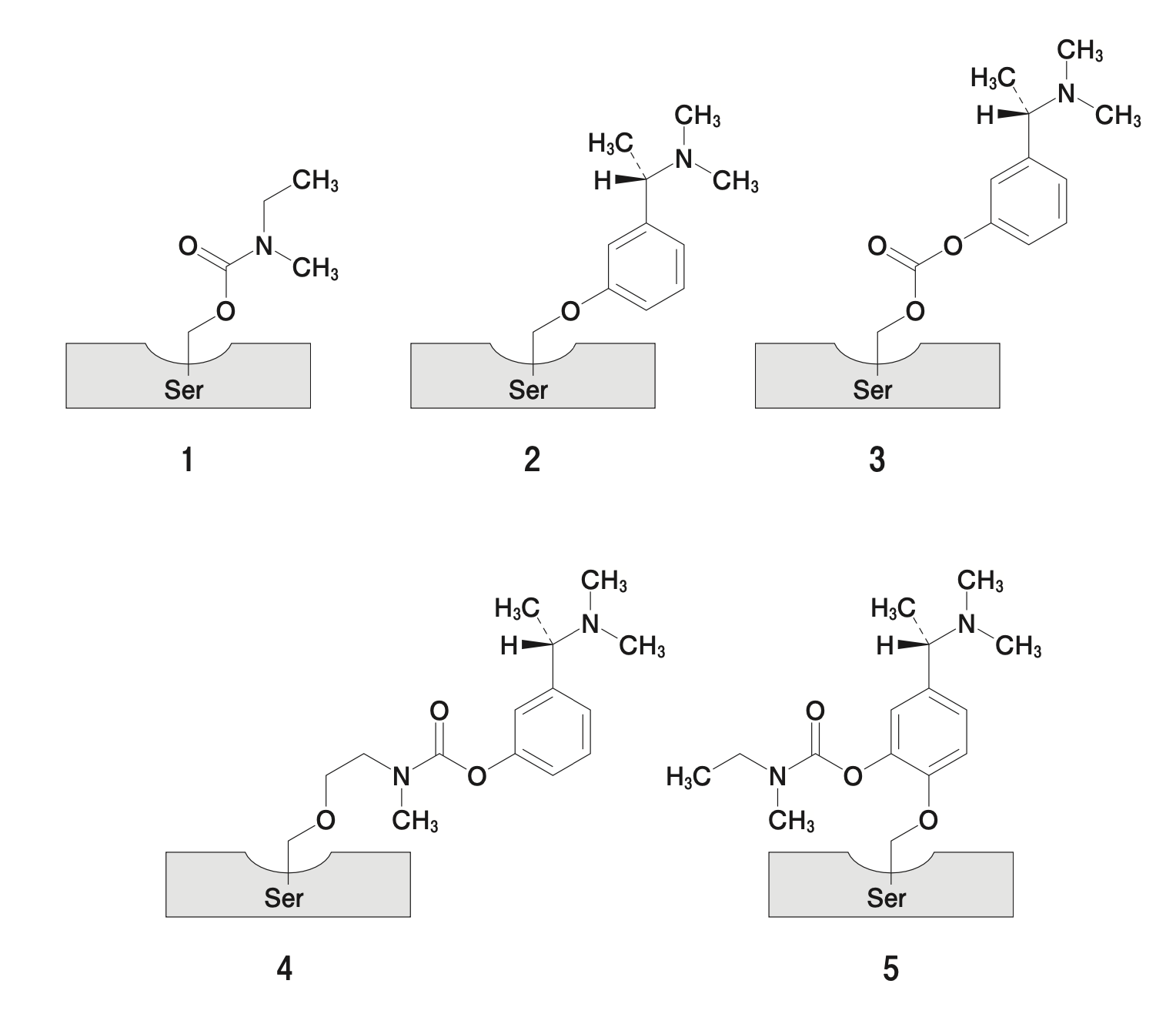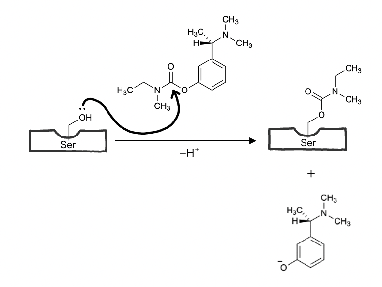 リバスチグミンは、カルバミン酸エステルの構造をもつアセチルコリンエステラーゼ阻害薬である。この薬剤は、アセチルコリンエステラーゼ(AChE)のセリン残基のヒドロキシル基と反応して、カルバミル化を引き起こし、酵素の働きを一時的に阻害する。
