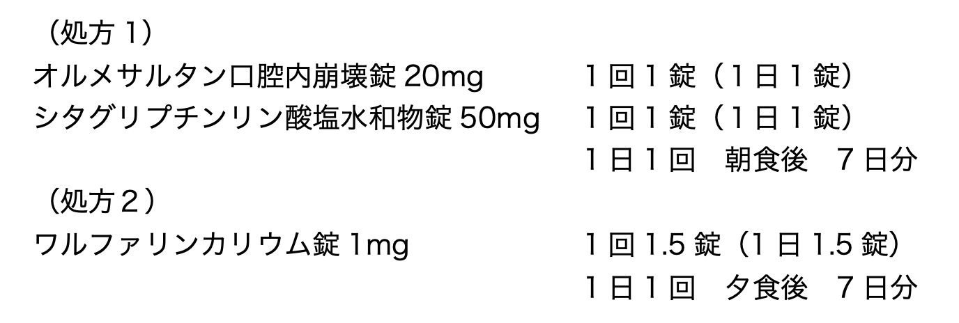 86歳女性。高血圧症と2型糖尿病。フレイルによる通院困難のため、多職種の訪問による自宅でのケアと処方1による薬物治療を受けていた。訪問医から病院の循環器科での検査入院を勧められ、心房細動の診断を受け、ワルファリンカリウムによる治療が開始された。退院後、娘が以下の処方箋を持って薬局を訪れた。