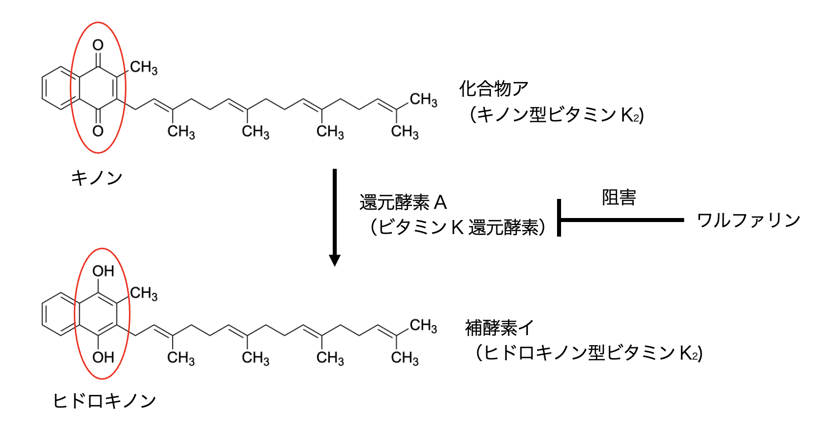 処方2に含まれる薬物は、下図のように、還元酵素Aを阻害することで、血液凝固系が機能するために必須な補酵素イが化合物アから生成されるのを抑制する。